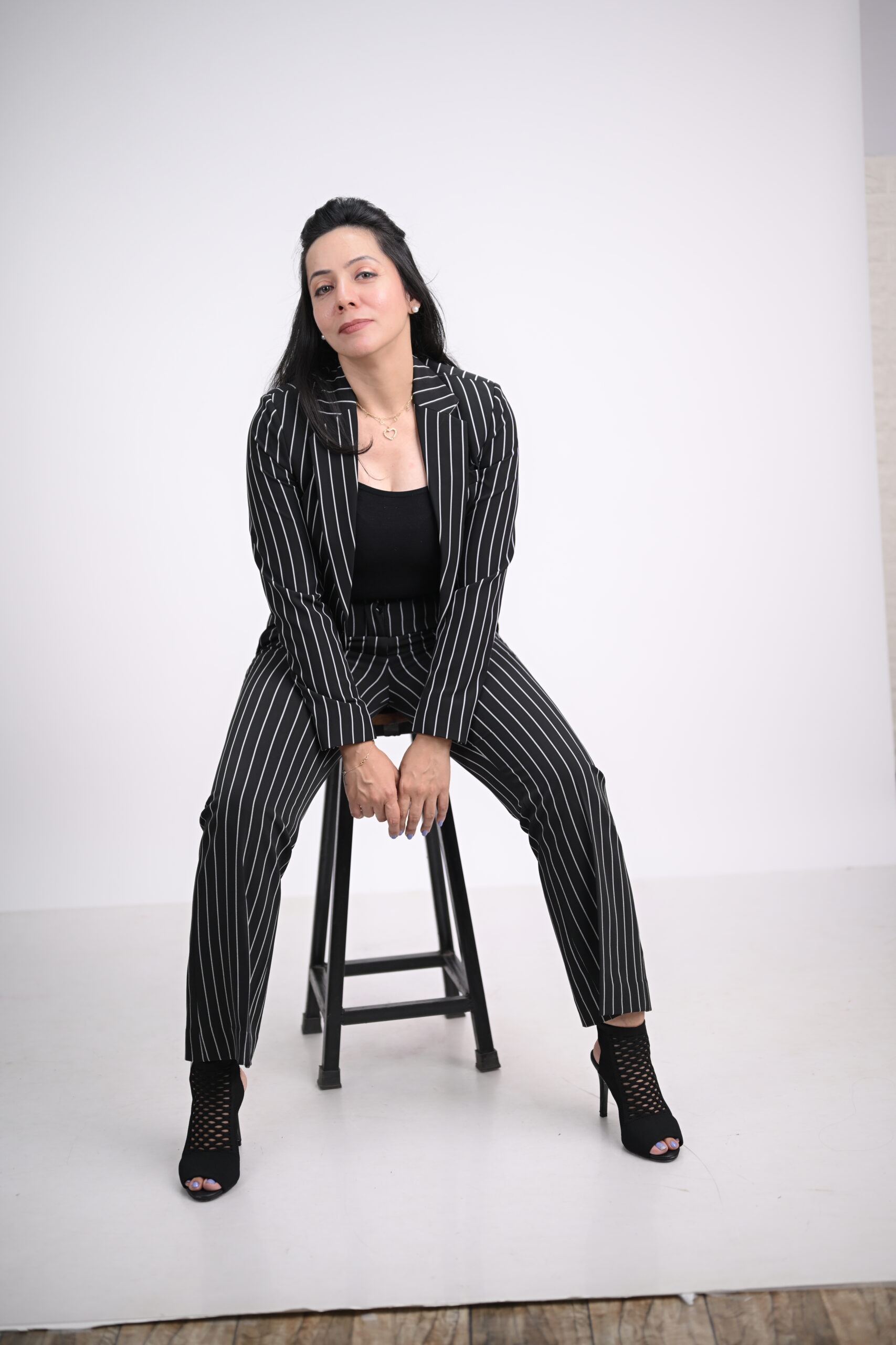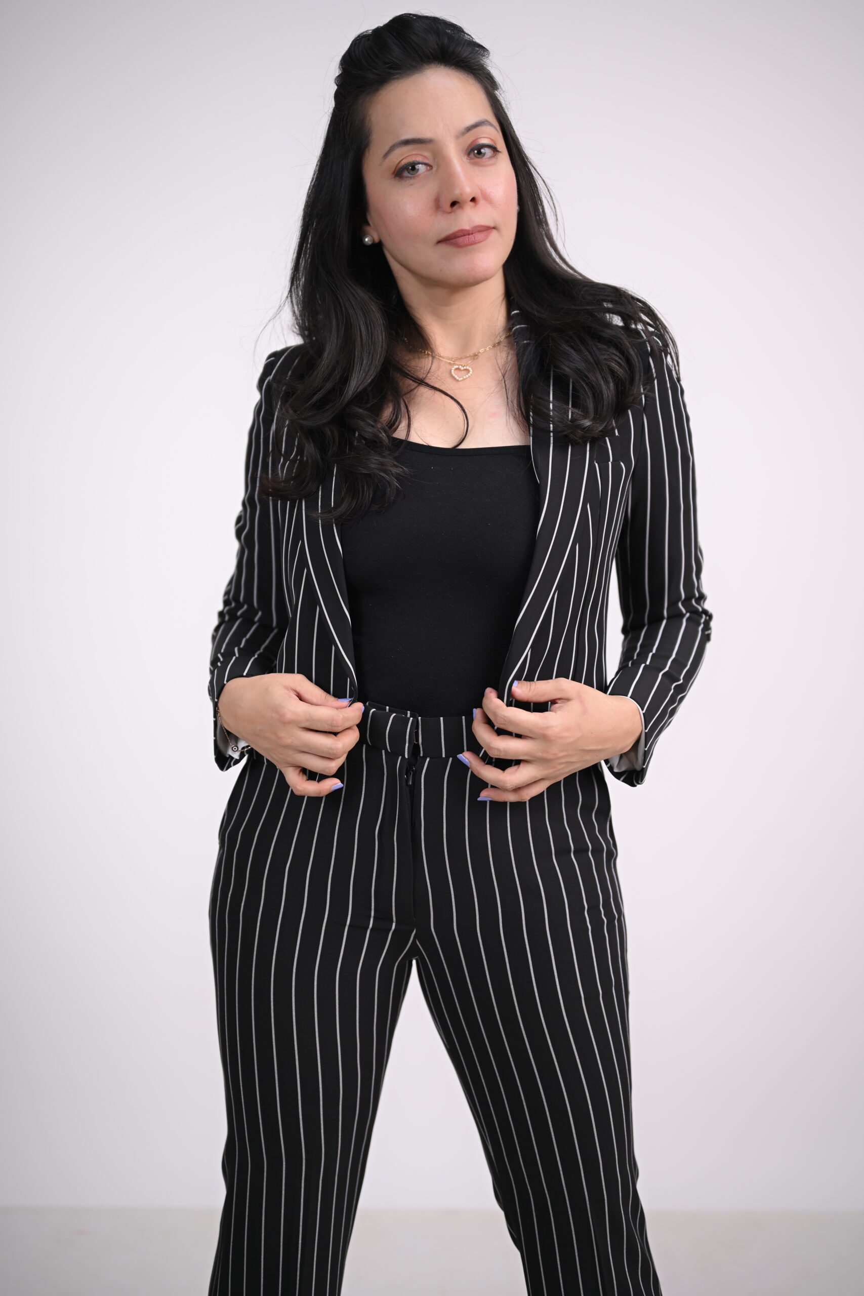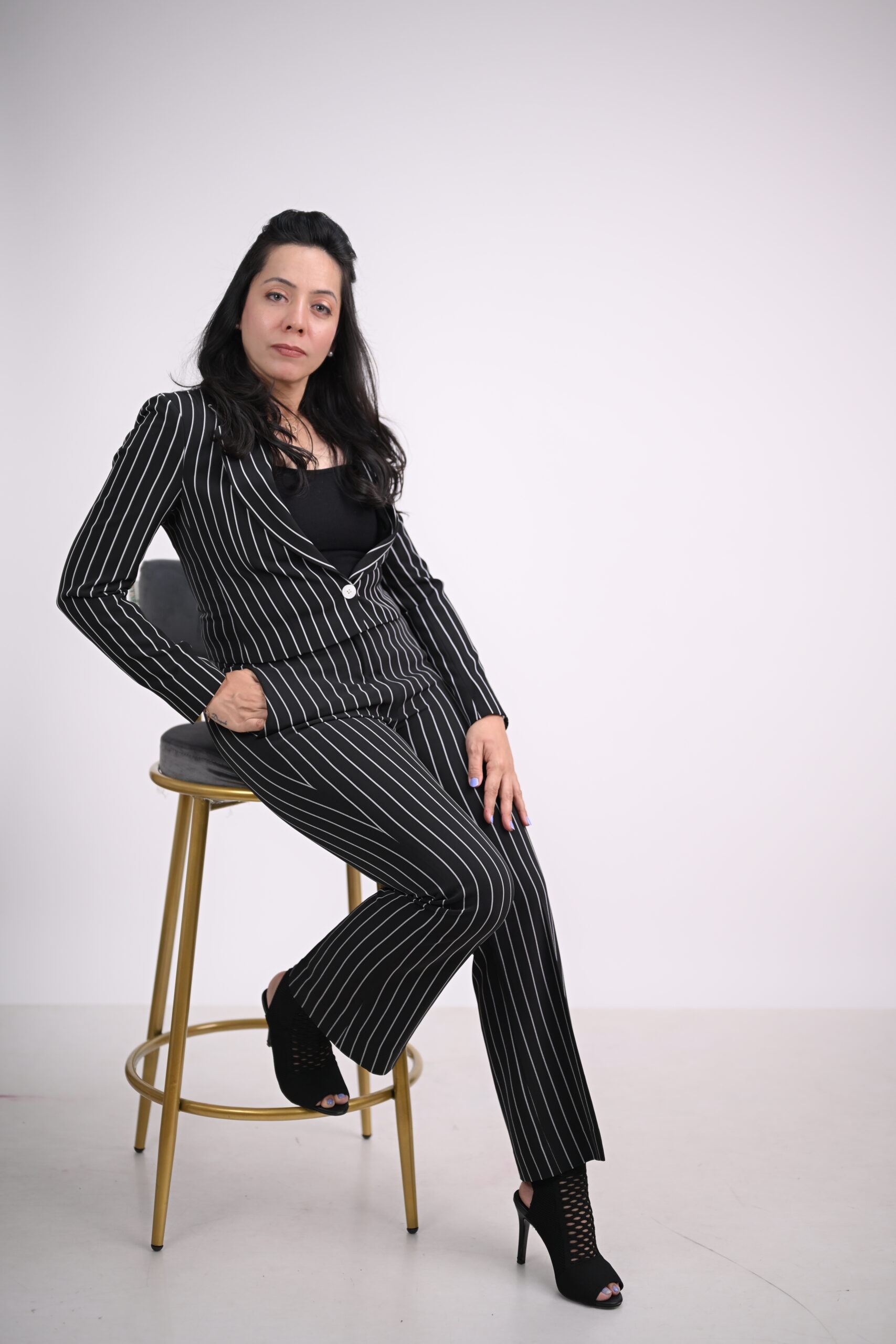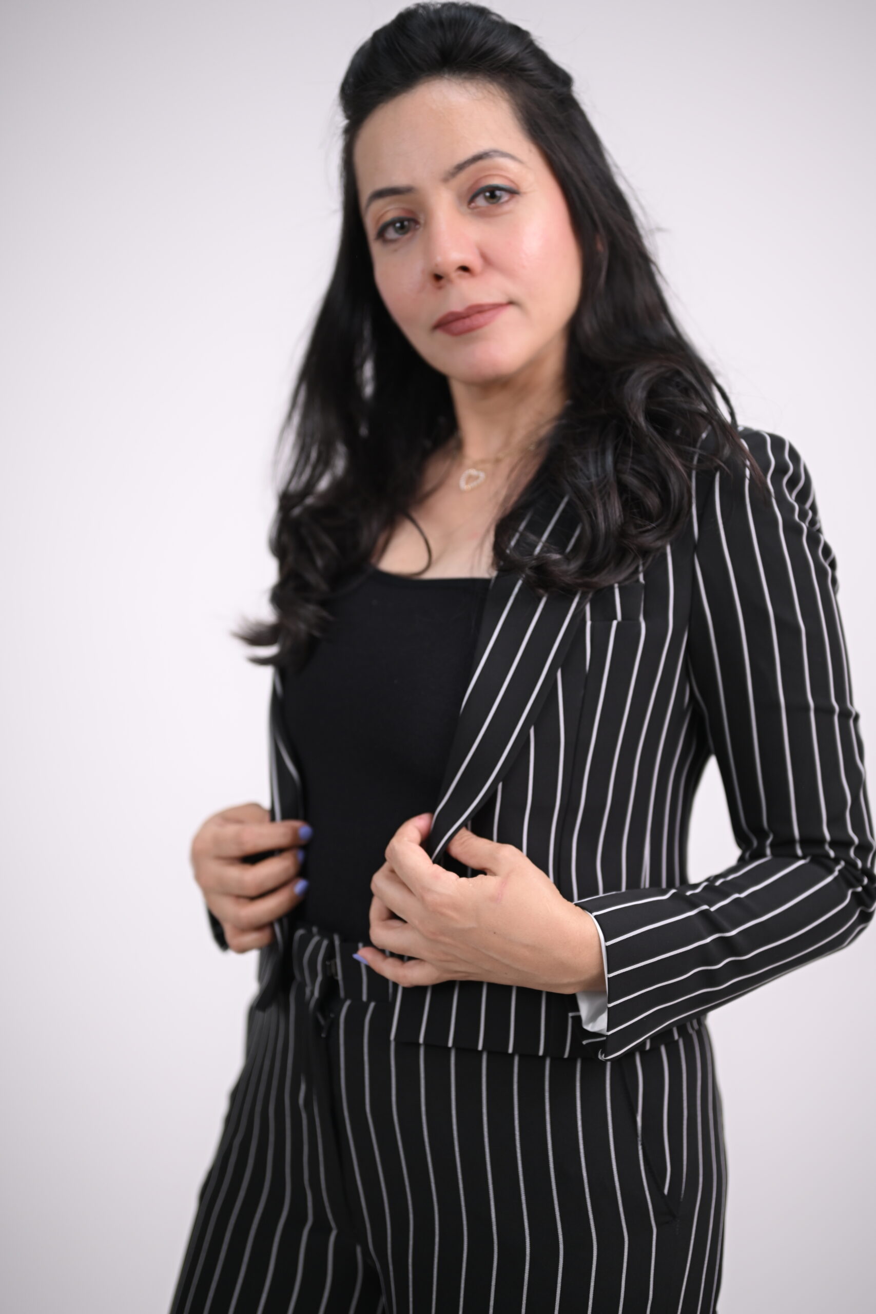 This high-end blazer and trouser combination. featuring a chic cropped a chic cropped silhouette, is designed for the modern woman who values elegance and fashion-forward style. Make a lasting impression with this exquisite ensemble.