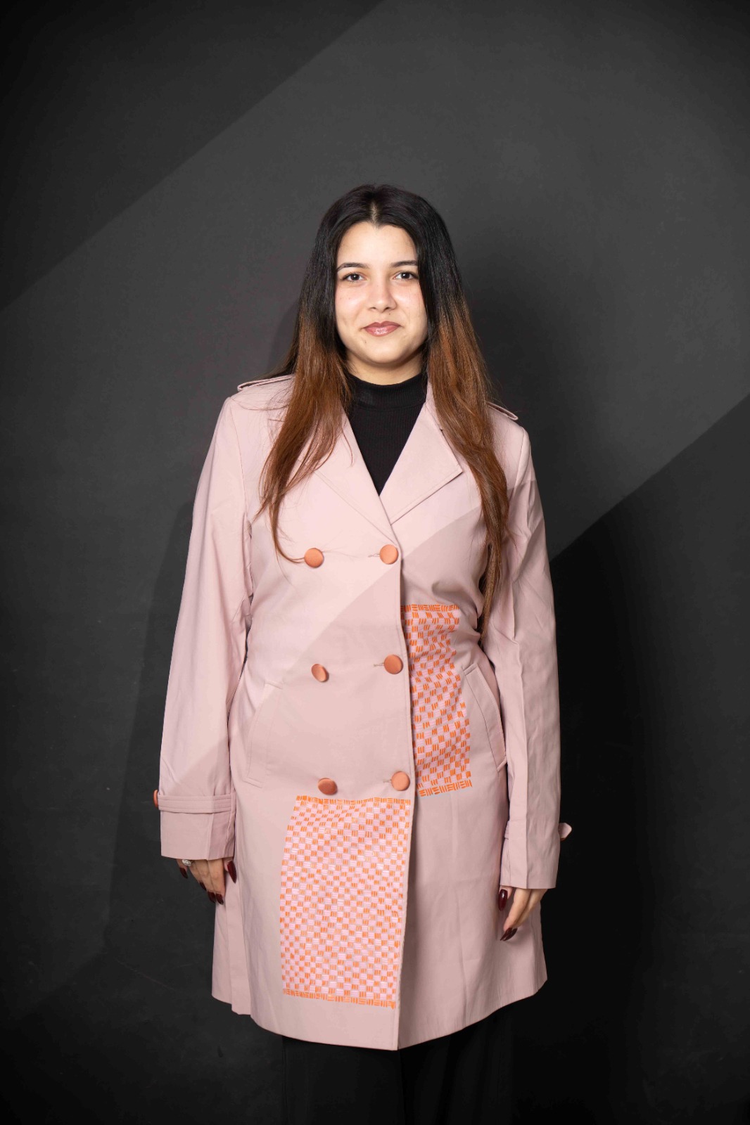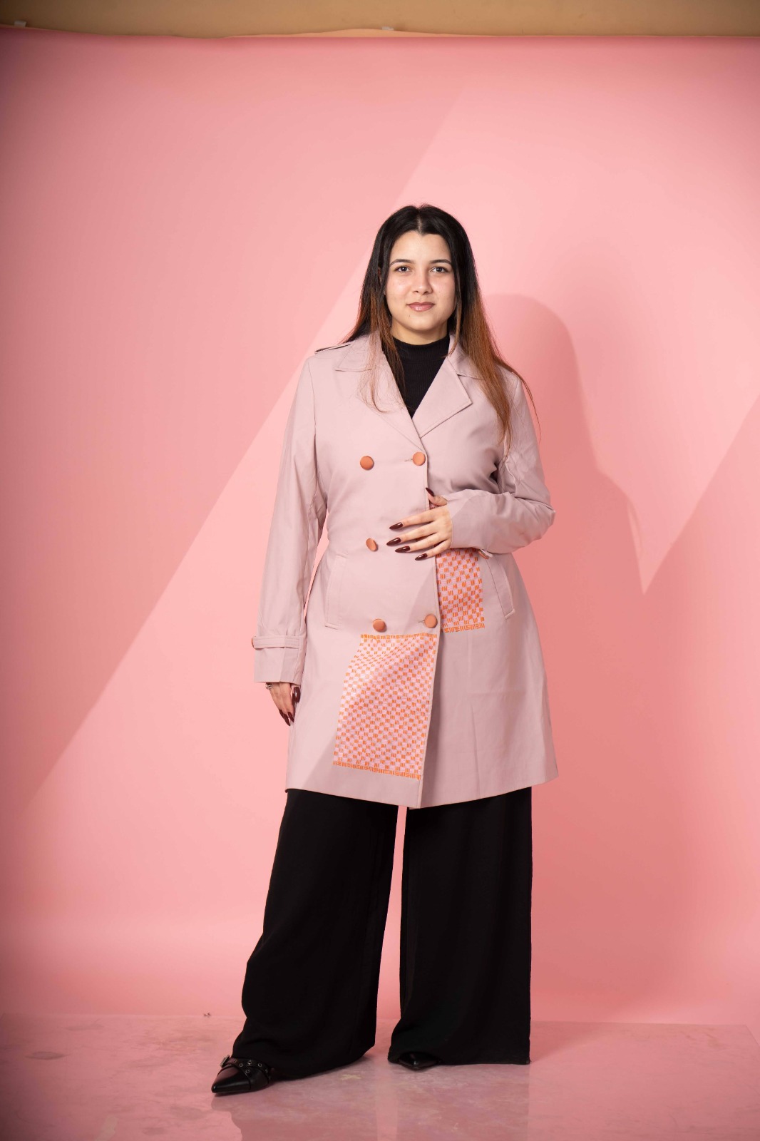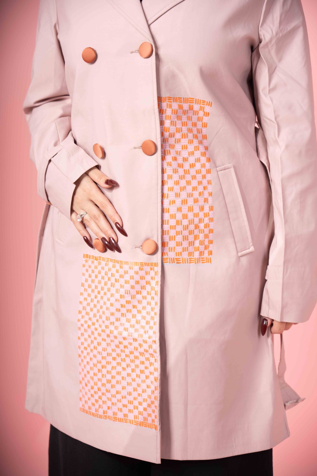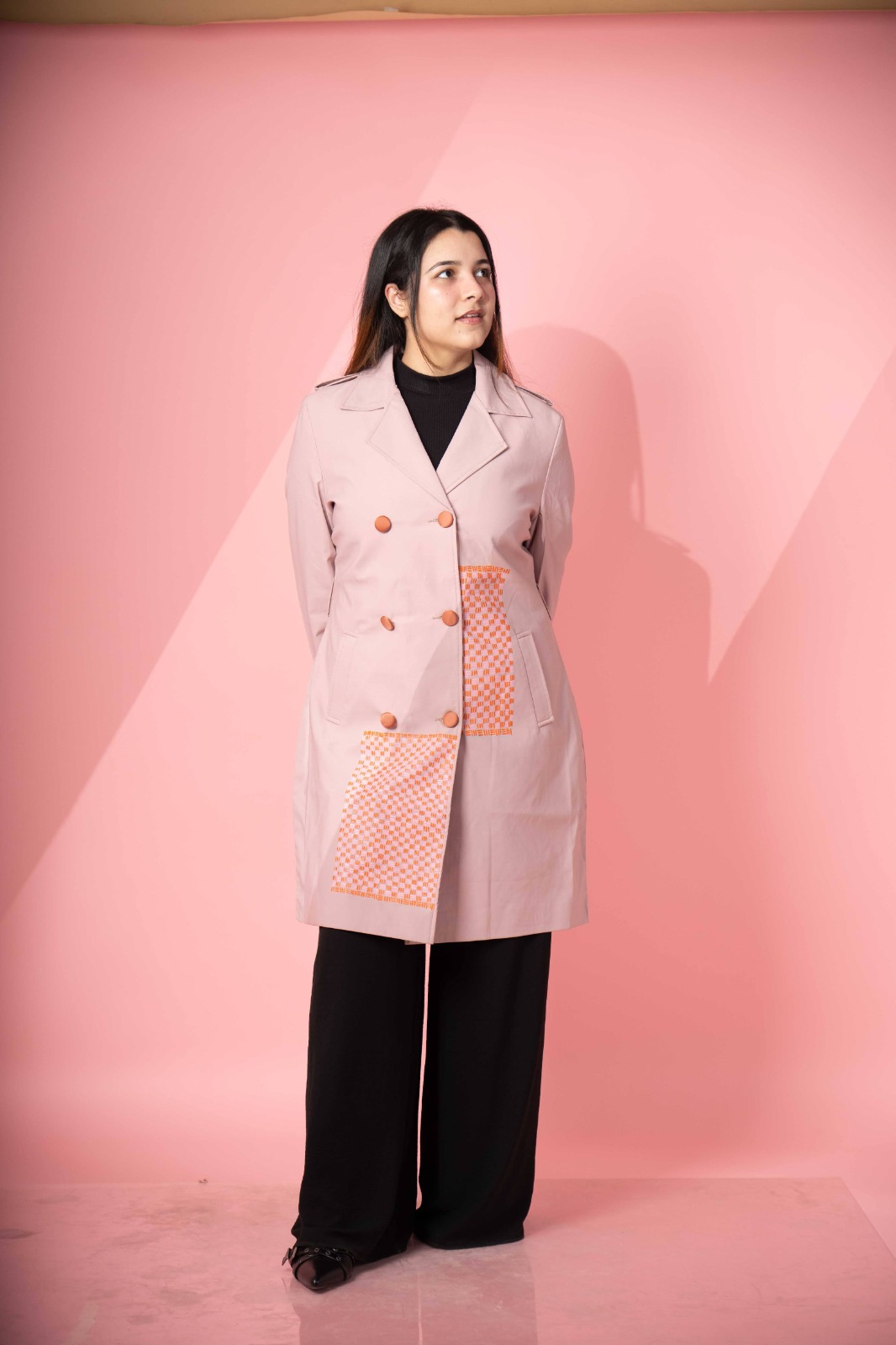 The Hand Adorned Coat in Coral is designed with elegance to make you feel powerful yet classy. The fabric and its texture are made with perfection for an edgy look.