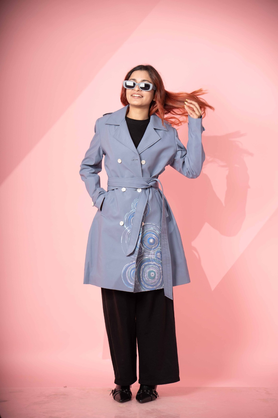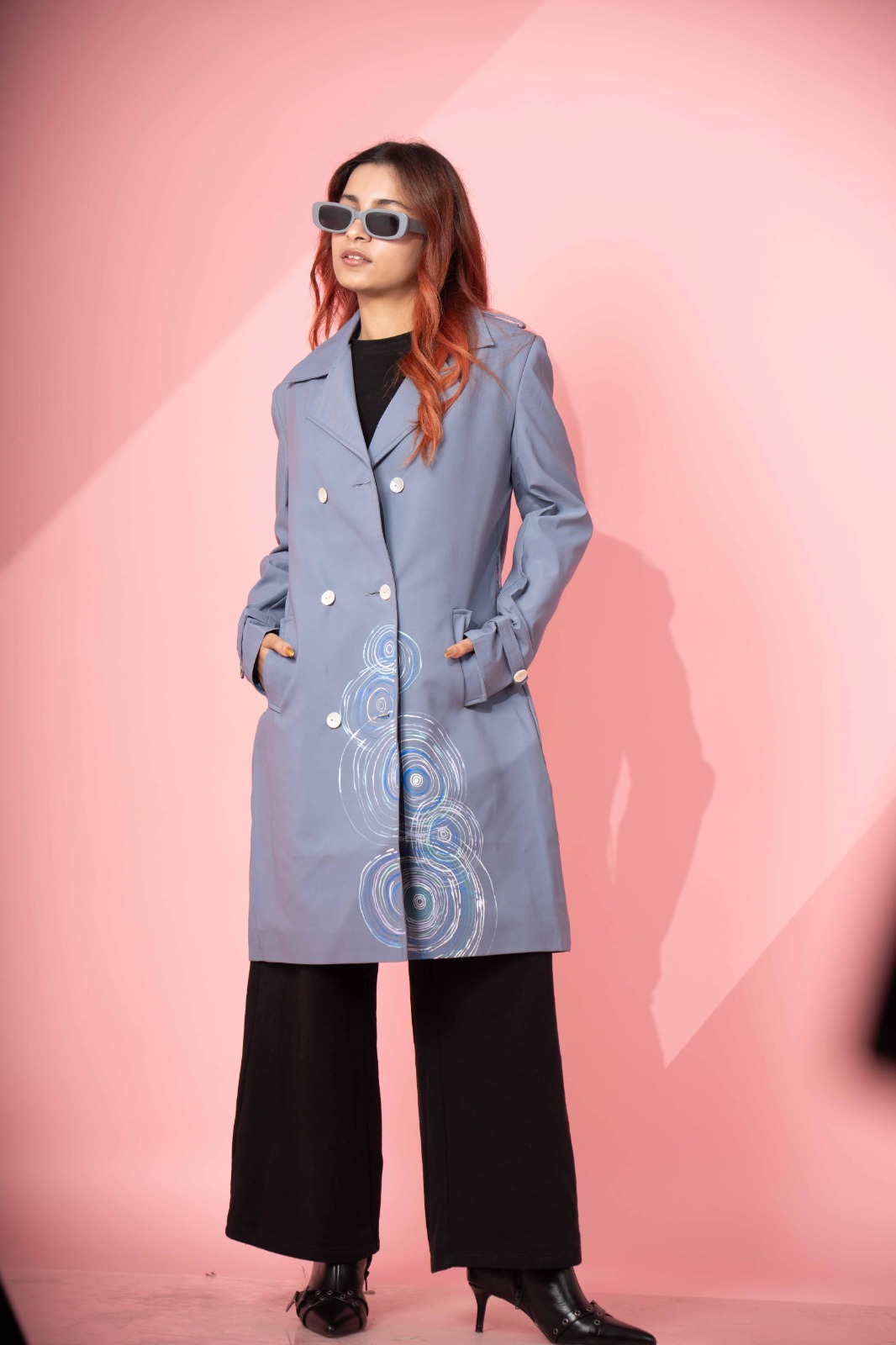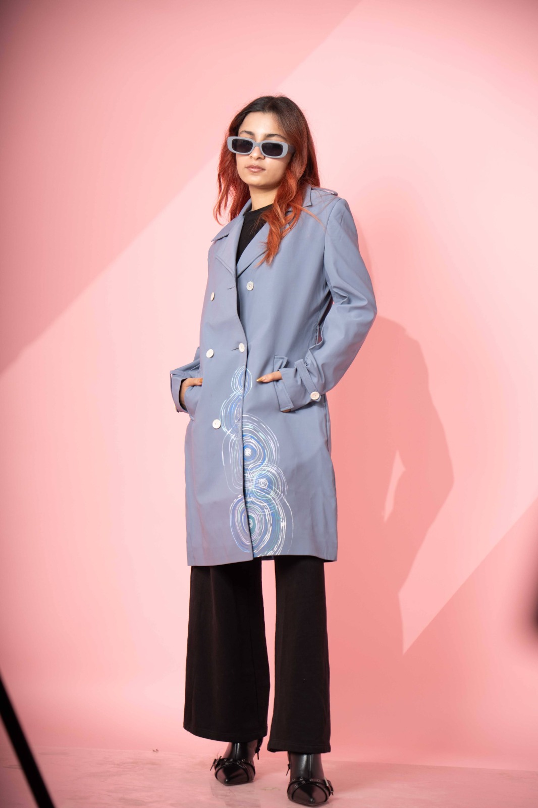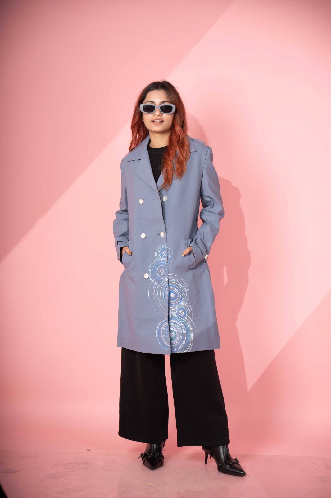 The hand-painted swirl coat in grey coral and indigo is designed with elegance to make you feel powerful yet classy. The fabric and its texture are made with perfection for an edgy look.