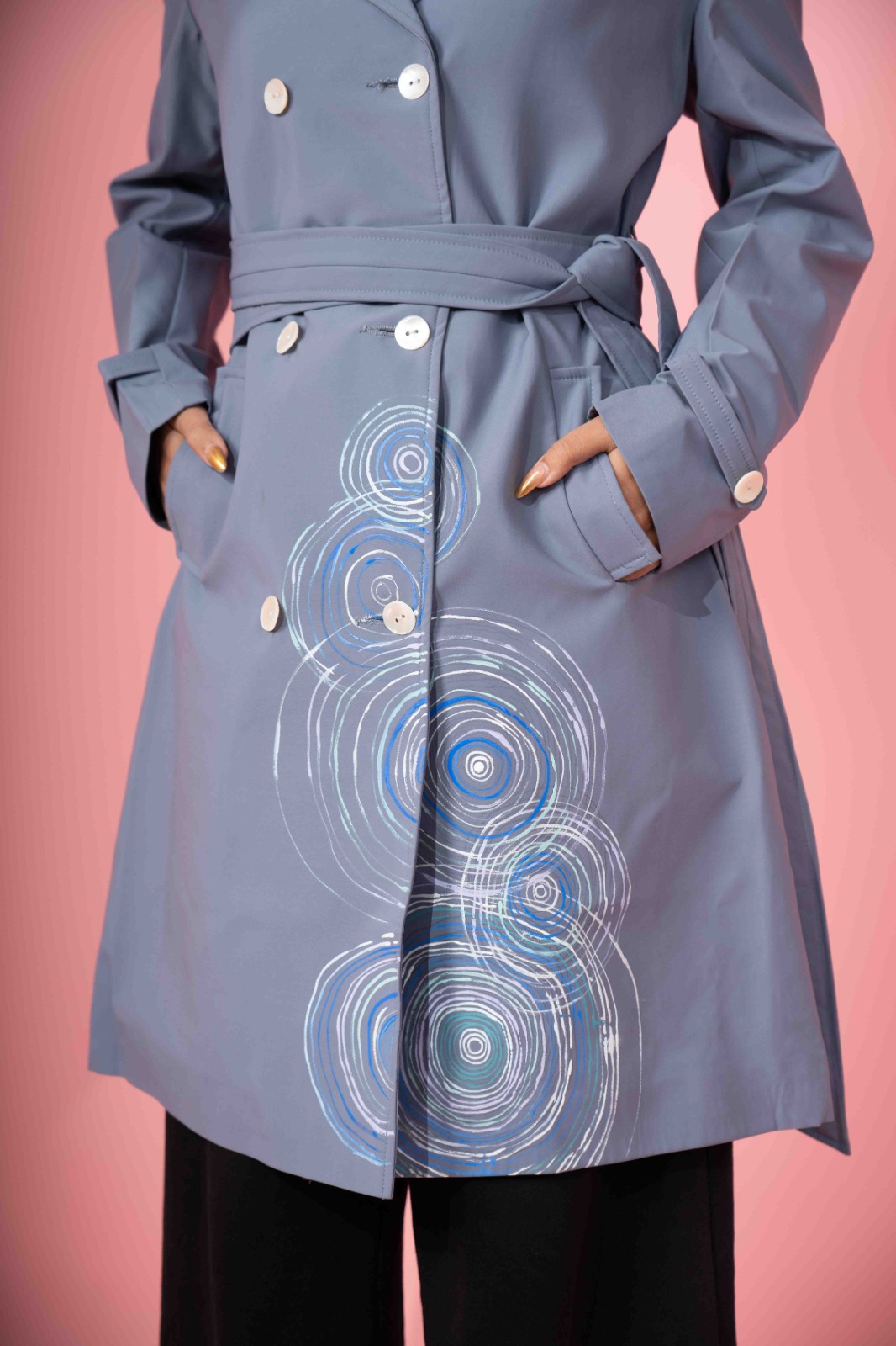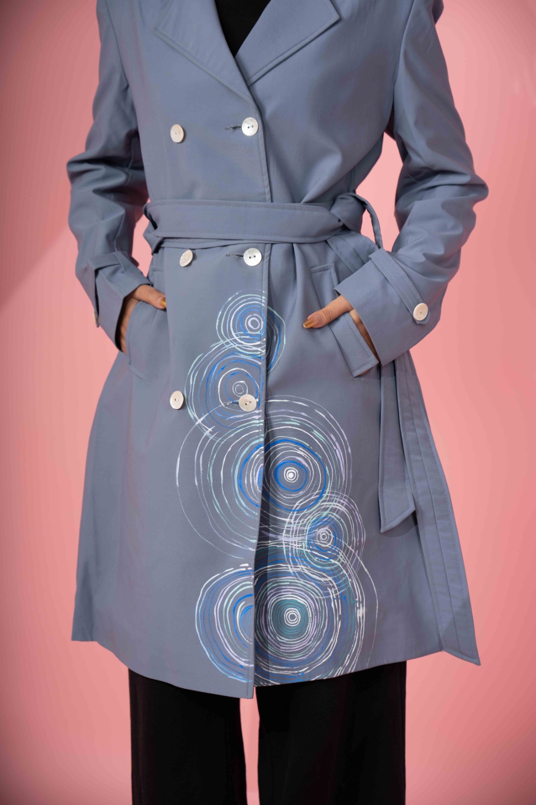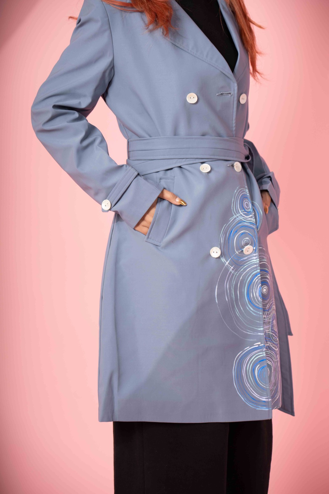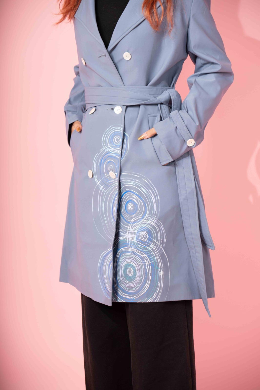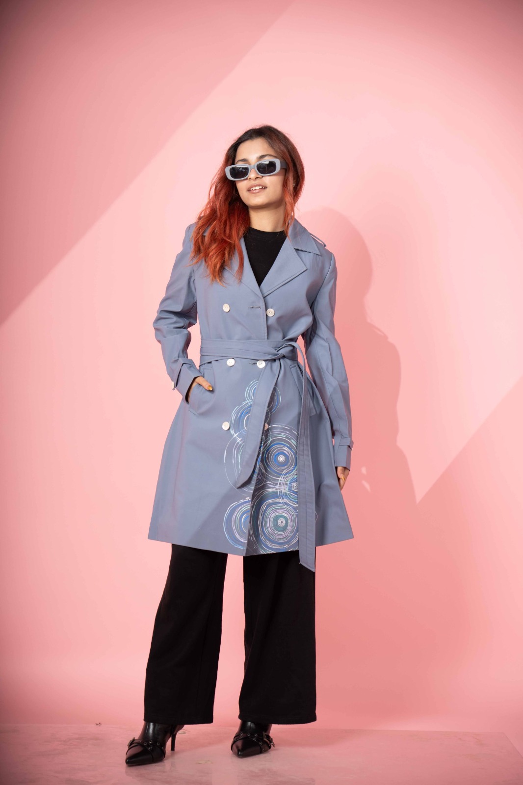 The hand-painted swirl coat in grey coral and indigo is designed with elegance to make you feel powerful yet classy. The fabric and its texture are made with perfection for an edgy look.
