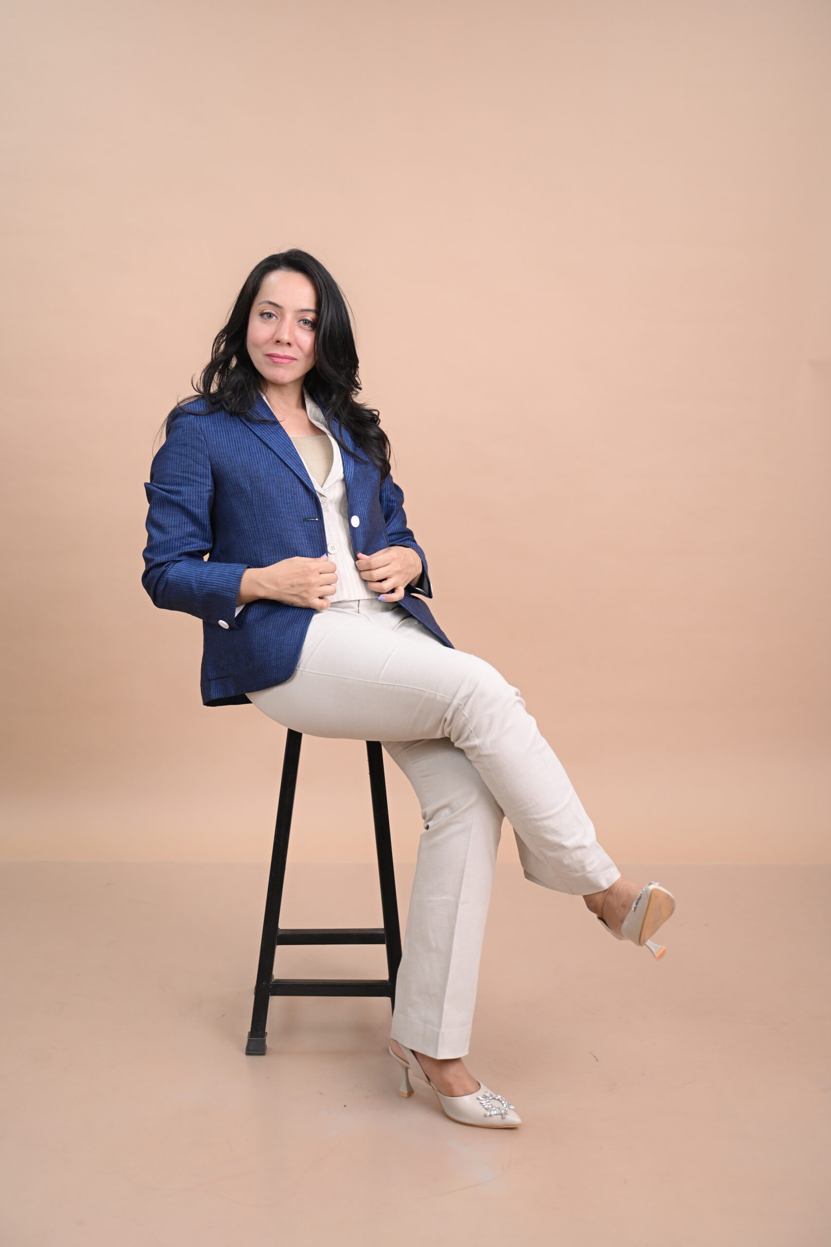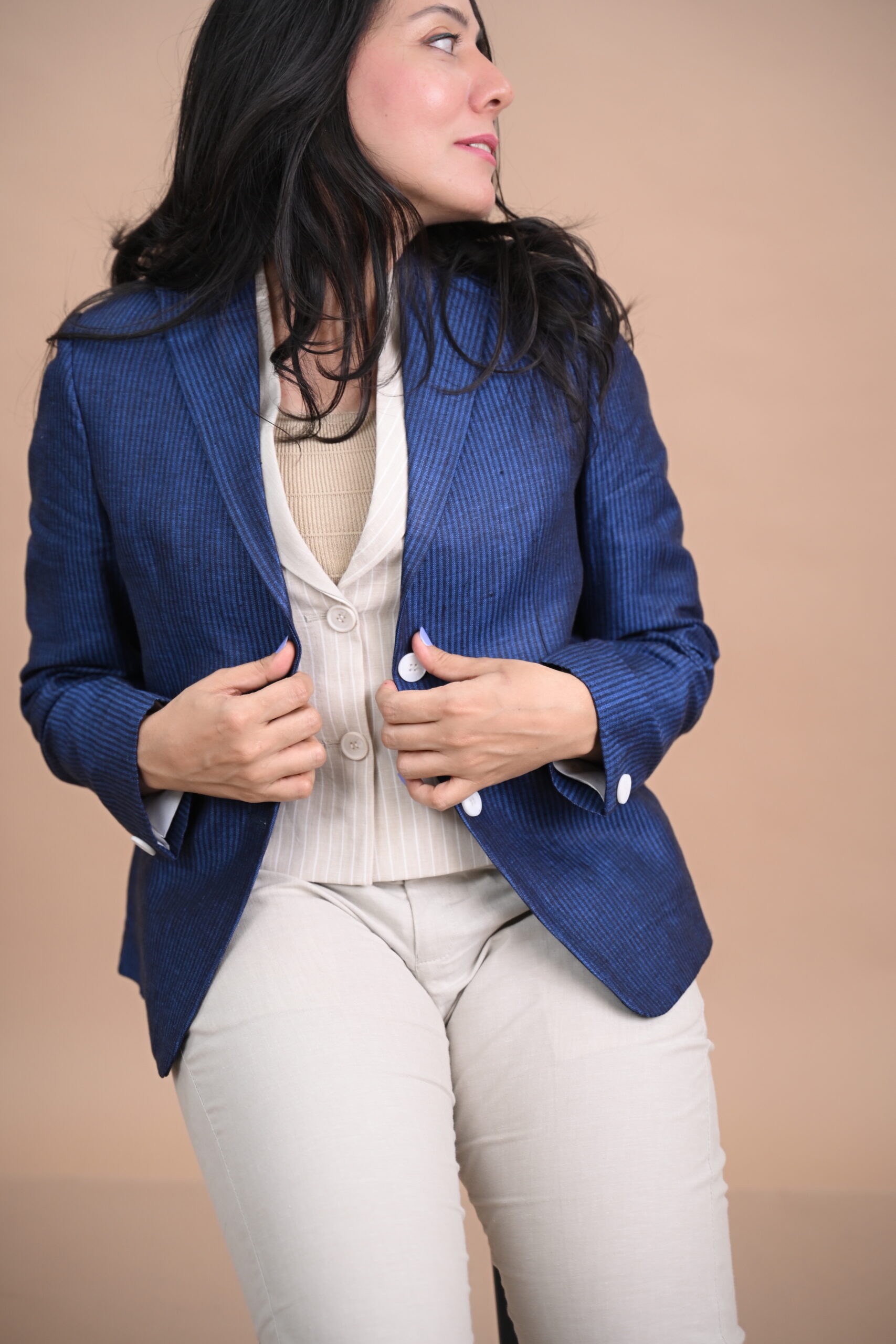 Introducing Royal Ribbon, a standout piece from our Femme Fatale collection. This royal blue linen blazer. with its graceful ribbon-like silhouette, exudes unparalleled sophistication and class.